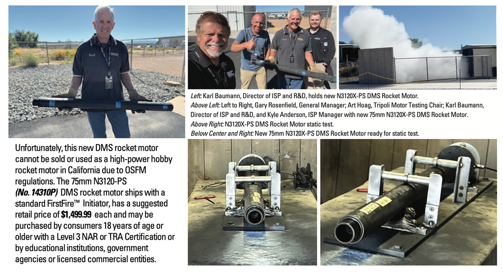 This DMS motor features a filament-wound fiberglass casing, a glass-reinforced composite phenolic nozzle, a machined aluminum bulkhead with a built-in 3/8-16 thread for a matching eye bolt and RCSs exclusive Propellant X™ aerospace grade composite propellant formulation, which is a high ISP propellant, and produces a bright white flame with a moderate amount of smoke.